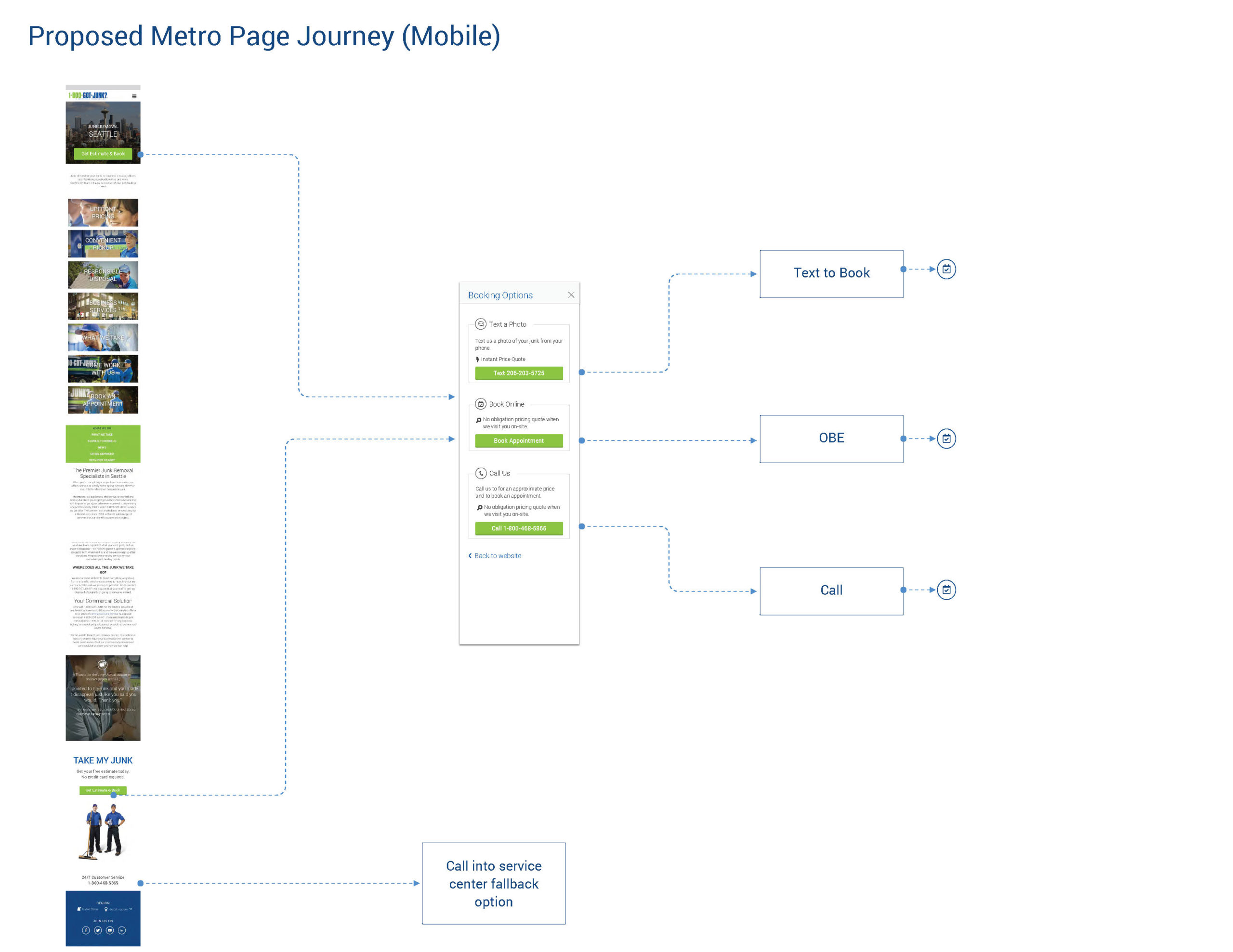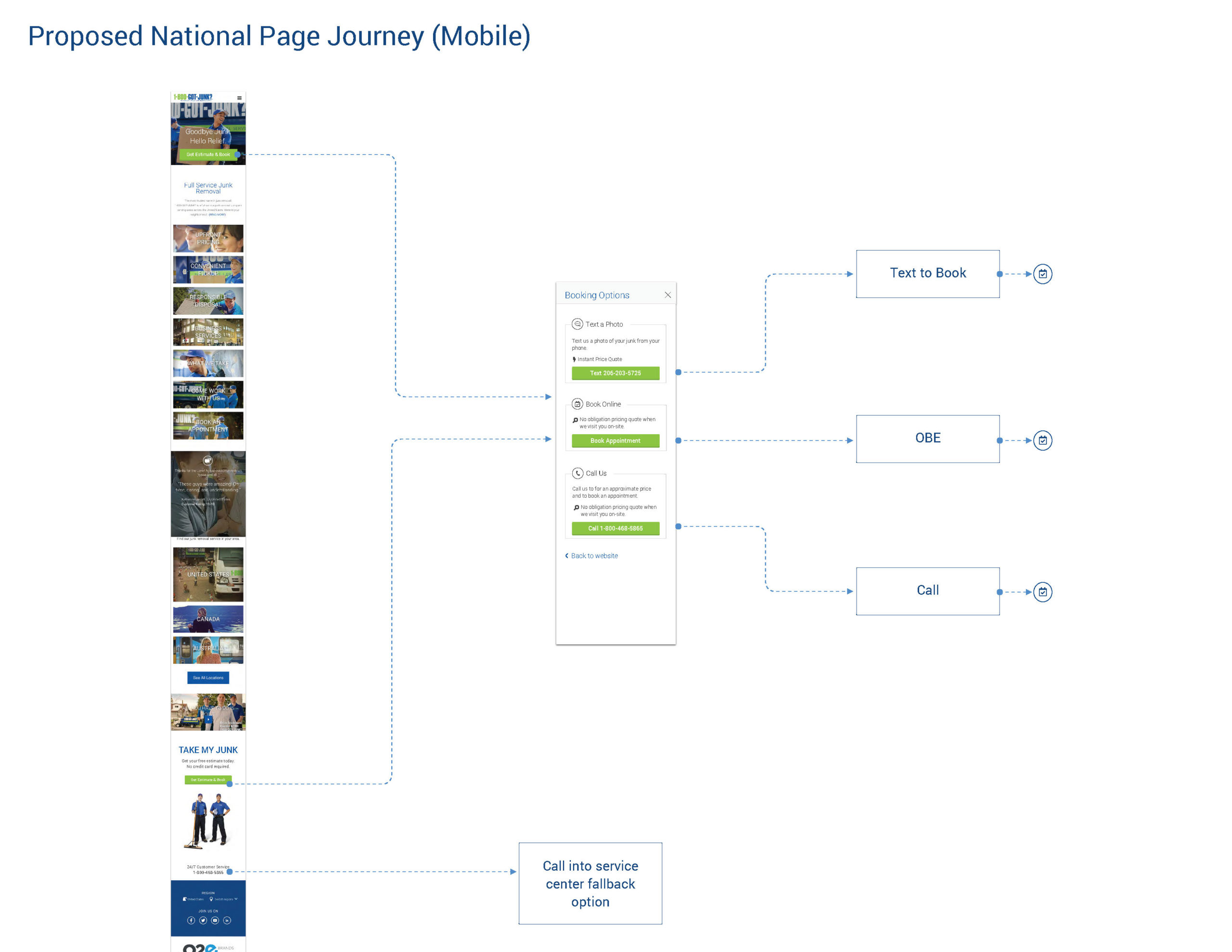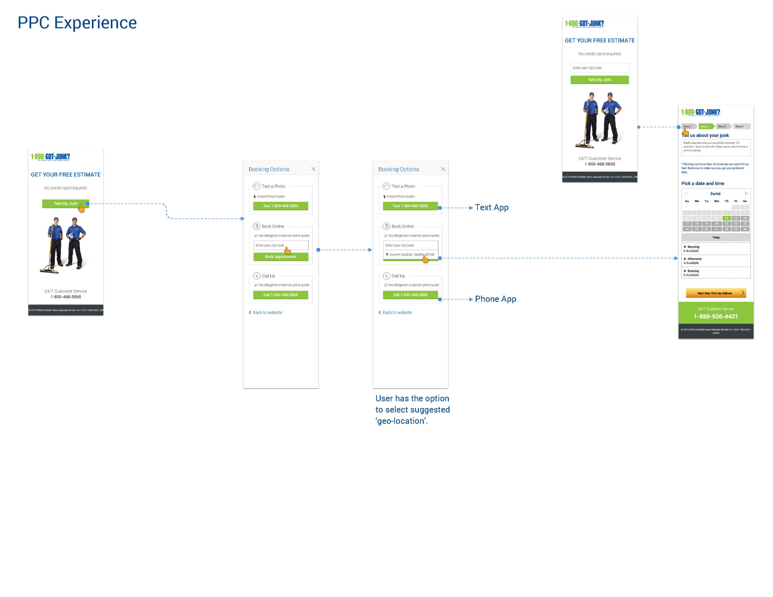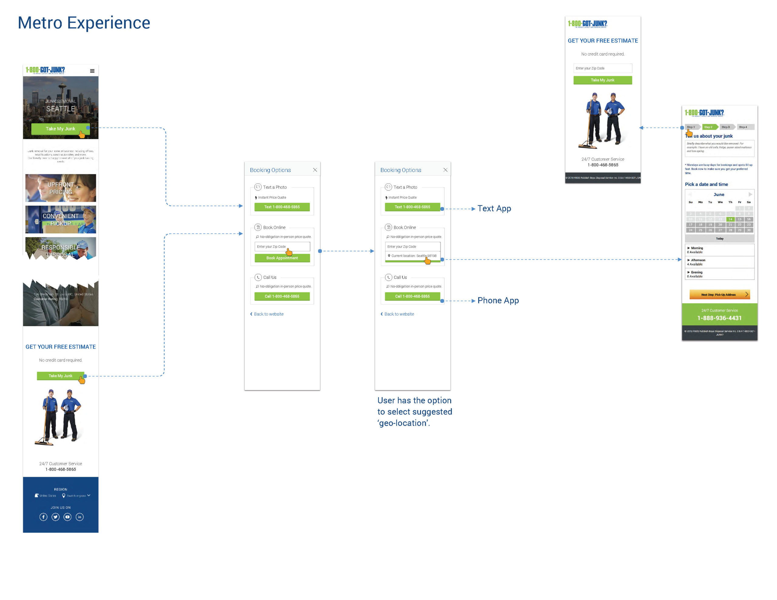 O2E Brands / 1800-Got-Junk was looking to improve its conversion through automated methods and reduce it’s call center costs, whilst still growing overall conversion and NPS. The company purchased Silicon Valley startup which provided junk removal quotes and booking through a mobile text booking system. They had run some pilot designs with some of their franchises which were poorly designed. Having worked with Stephen on some other projects, they brought him in run a user-centered design process to introduce a text-based booking system MVP into their online responsive website.