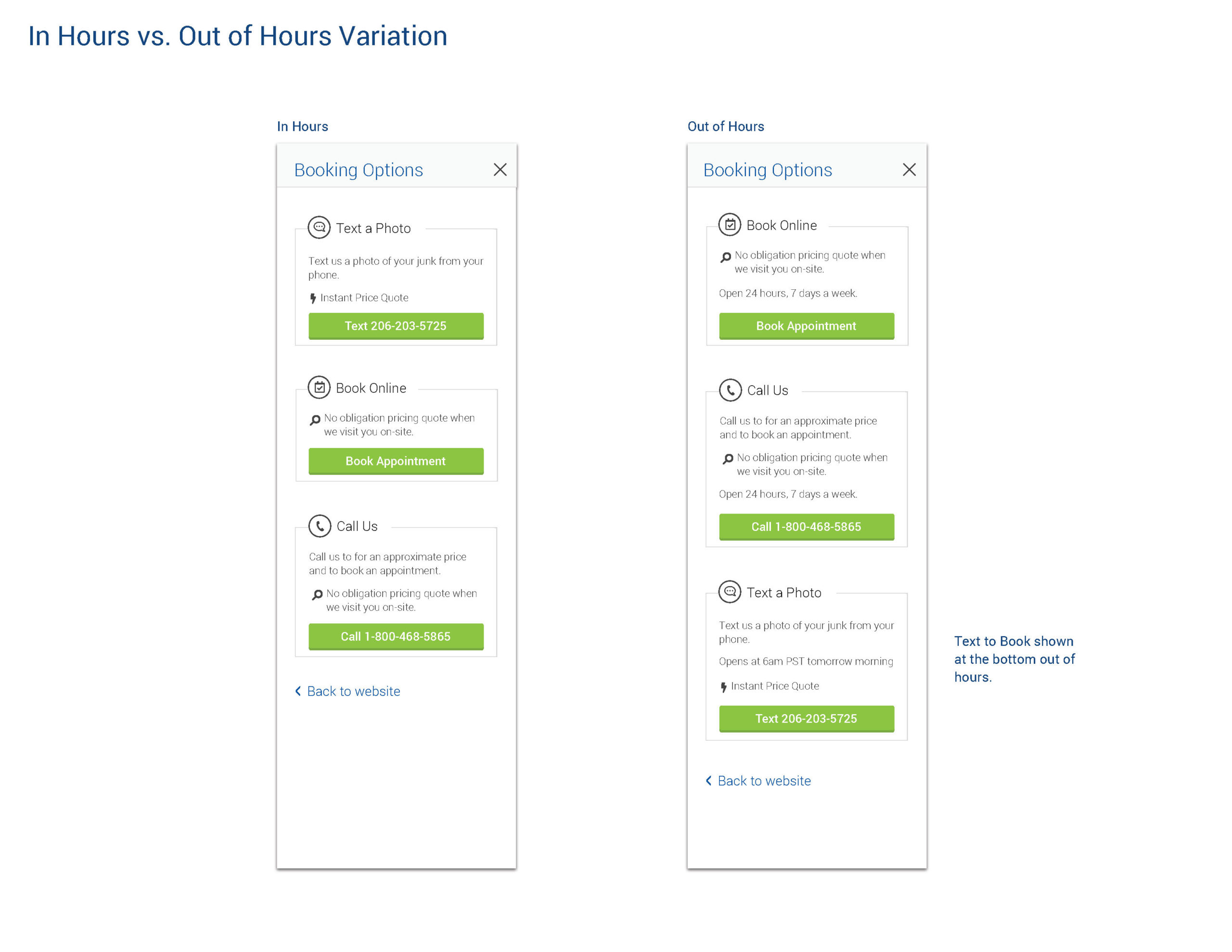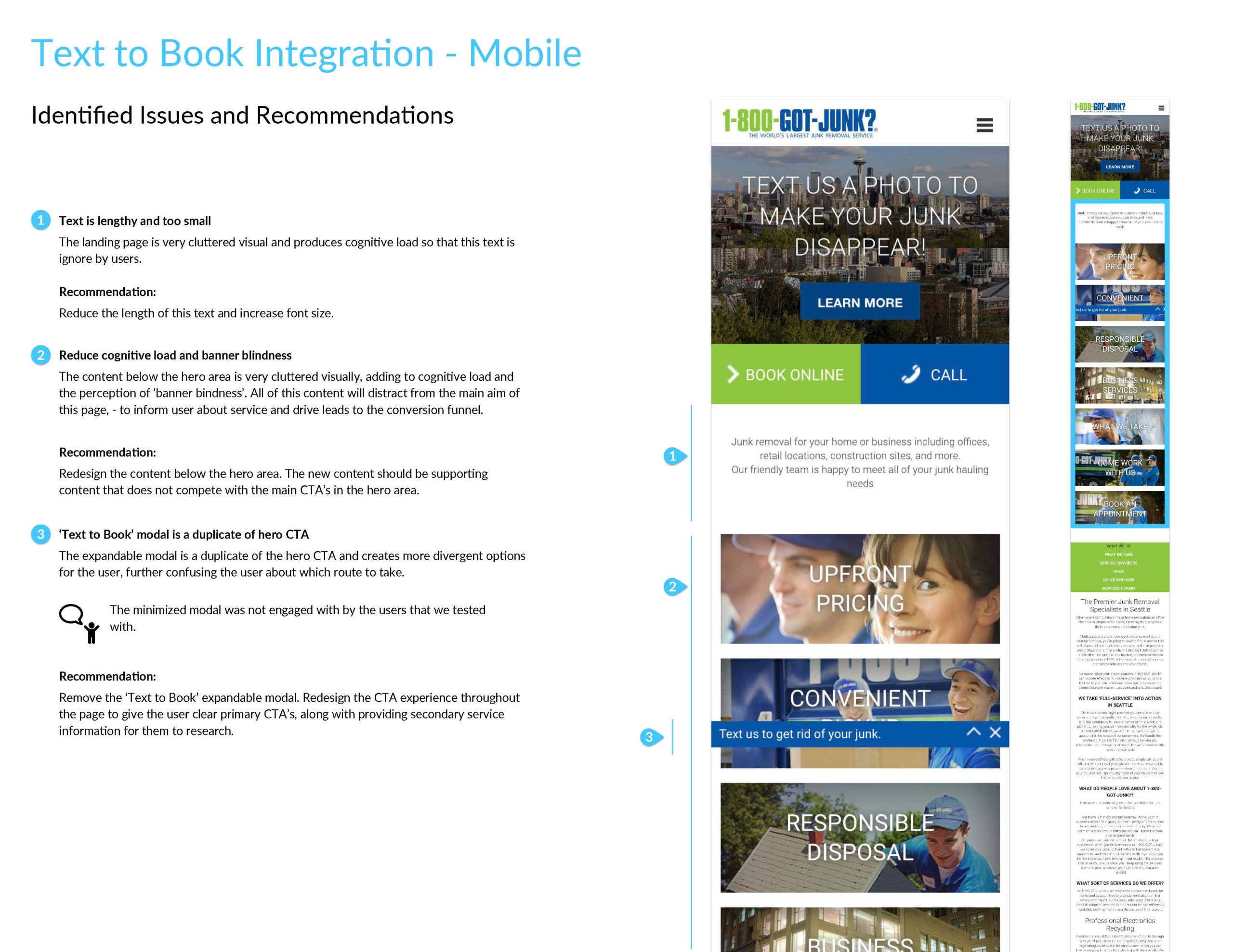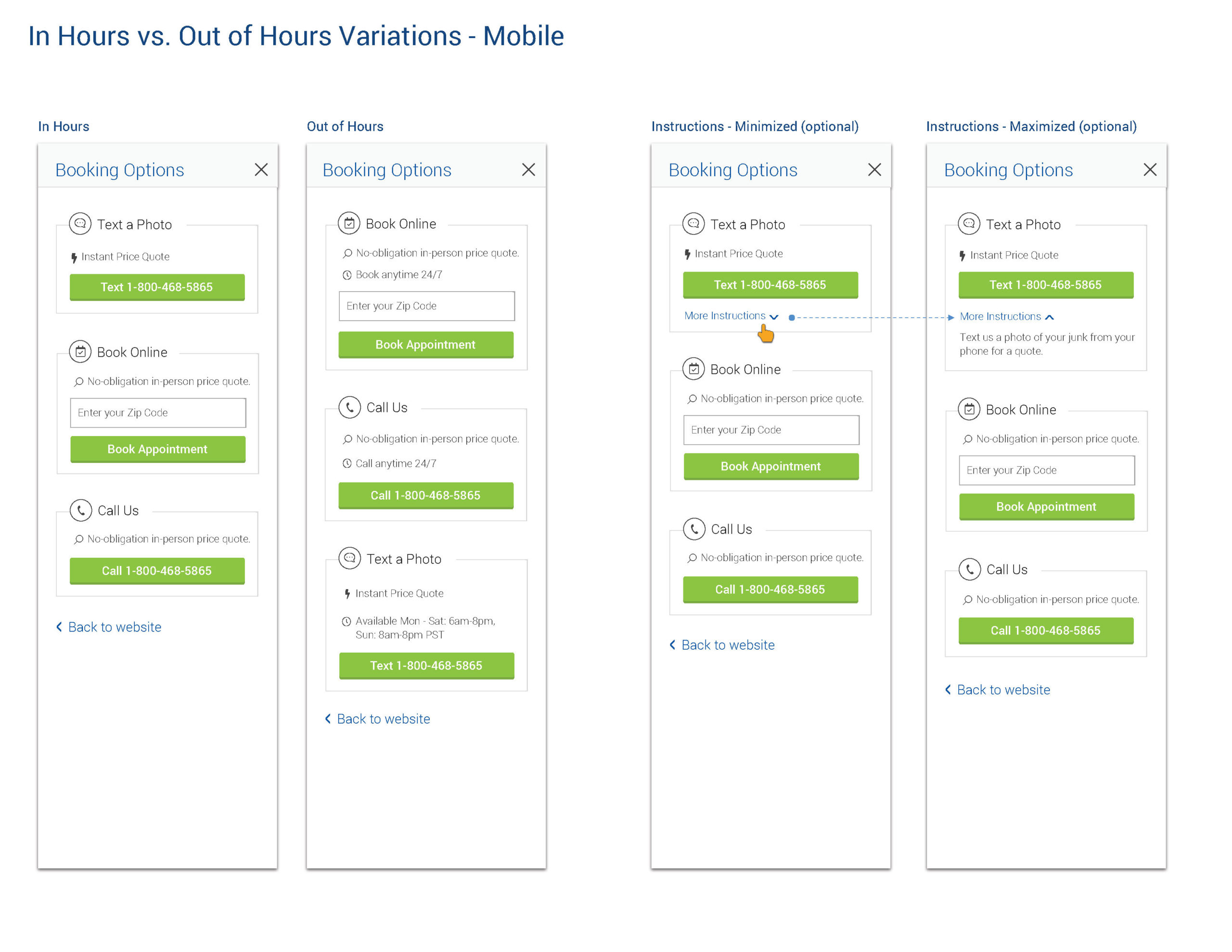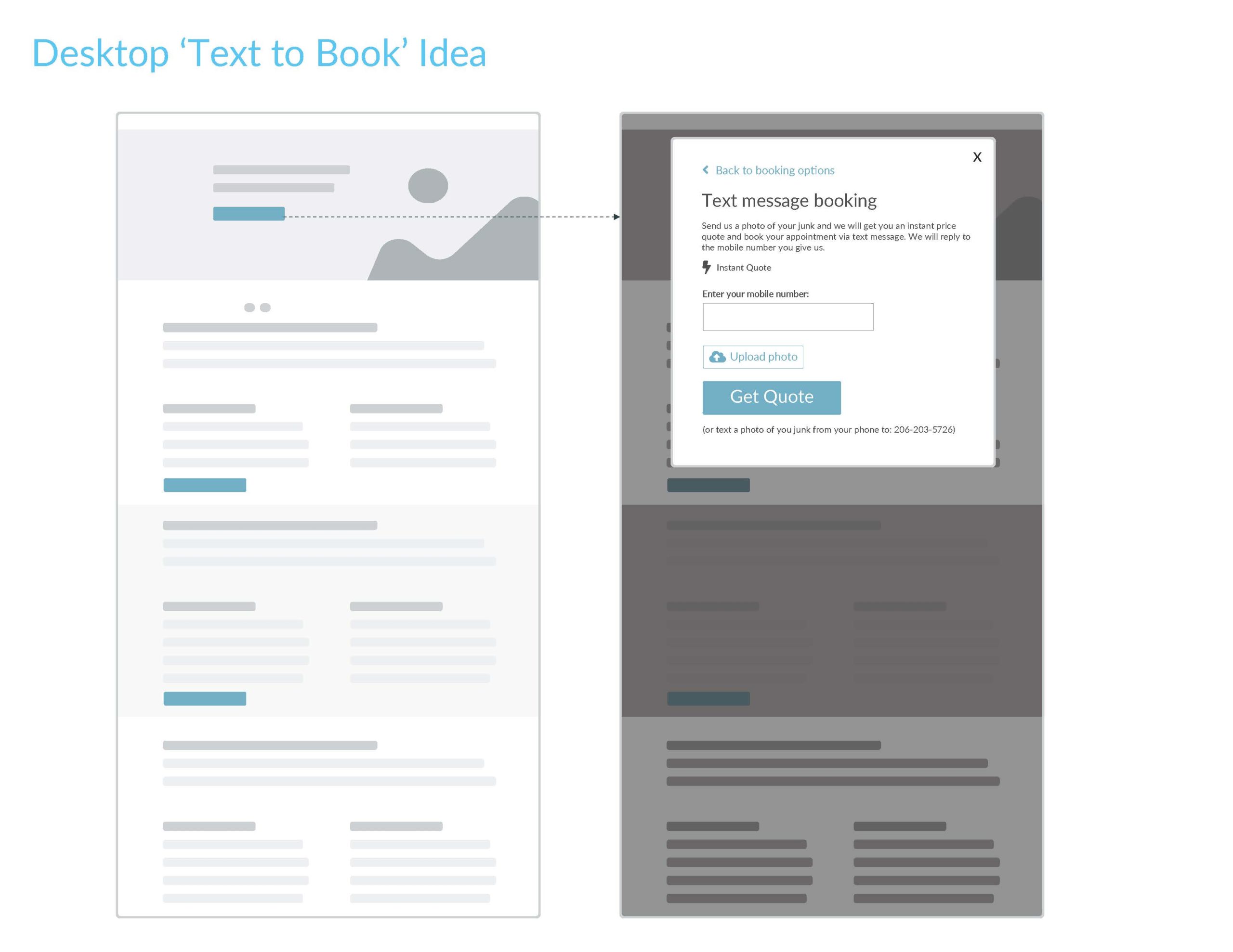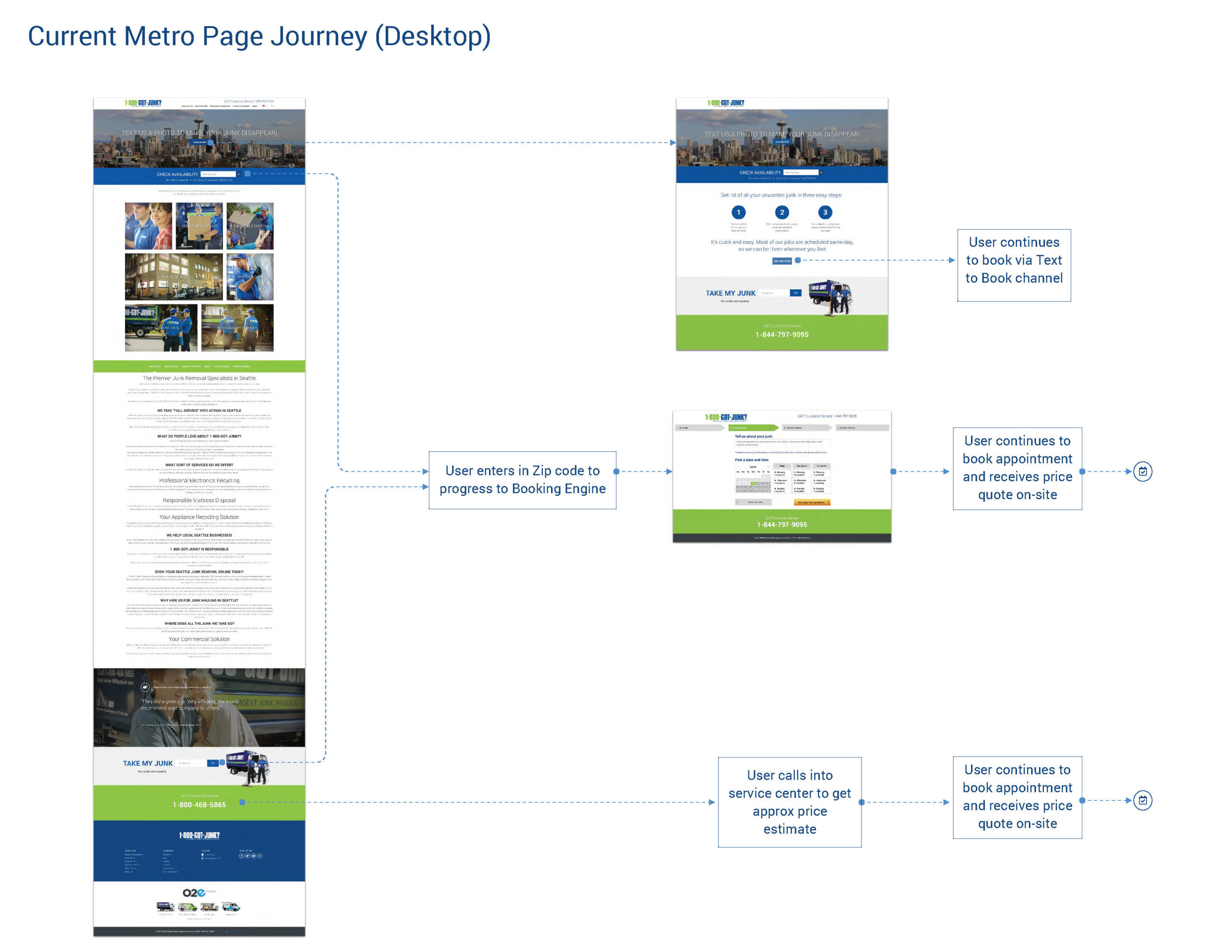 O2E Brands / 1800-Got-Junk was looking to improve its conversion through automated methods and reduce it’s call center costs, whilst still growing overall conversion and NPS. The company purchased Silicon Valley startup which provided junk removal quotes and booking through a mobile text booking system. They had run some pilot designs with some of their franchises which were poorly designed. Having worked with Stephen on some other projects, they brought him in run a user-centered design process to introduce a text-based booking system MVP into their online responsive website.